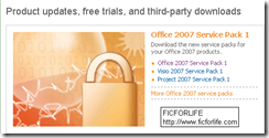 Pertama anda menuju ke halaman utama dari Microsoft Office di http://office.microsoft.com/en-us/downloads/default.aspx. Pada webpage itu ada tulisan tentang Office 2007 service pack 1 seperti pada gambar: