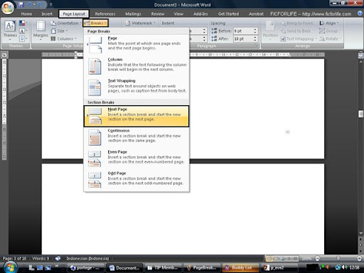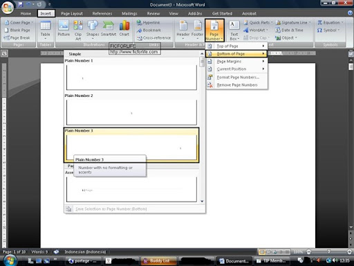 Pertama buka dokumen kosong / baru pada Word 2007. Kemudian masuk ke tab Insert, klik tombol Page Number, kemudian klik Bottom of Page, dan pilih Plain Number 3. Hal ini dapat dilihat seperti pada gambar 1. Kemudian klik tab Page Layout, tekan tombol Breaks, dan pilih Page. Lakukan dua kali untuk mendapatkan tiga halaman dokumen kosong.