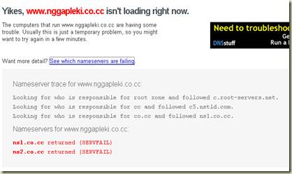 Mungkin dari beberapa pengguna CO.CC sudah merasakan enaknya gratisan yang disediakan CO.CC. Akan tetapi, terkadang CO.CC juga mengalami downtime. Seperti contoh di atas, CO.CC mengalami failure pada Name Server mereka, sehingga nggapleki.co.cc tidak dapat dibuka. Hal ini dapat diatasi dengan “MENUNGGU” dengan sabar. Beberapa pengalaman menunjukkan failure ini hanya berlangsung beberapa saat. Ditinggal makan juga sudah sembuh sendiri. Just share :D