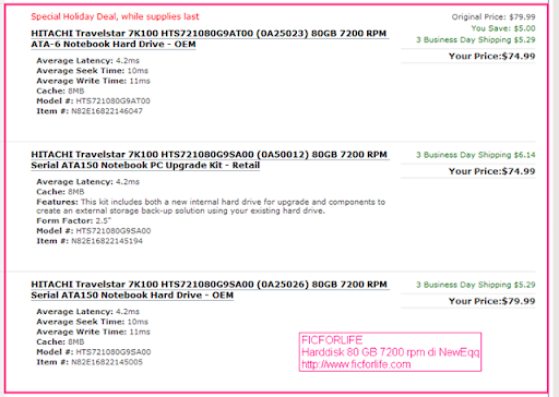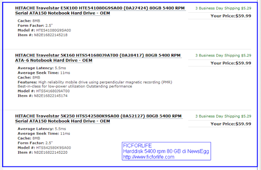 Penulis terpaksa membandingkan dengan harddisknya dengan menggunakan Newegg karena di web Indonesia local tidak ada yang menjual harddisk 7200 rpm. Satu-satunya cara untuk mendapatkan harddisk 7200 rpm yang penulis tahu adalah dengan memesan laptop DELL dan minta secara khusus.